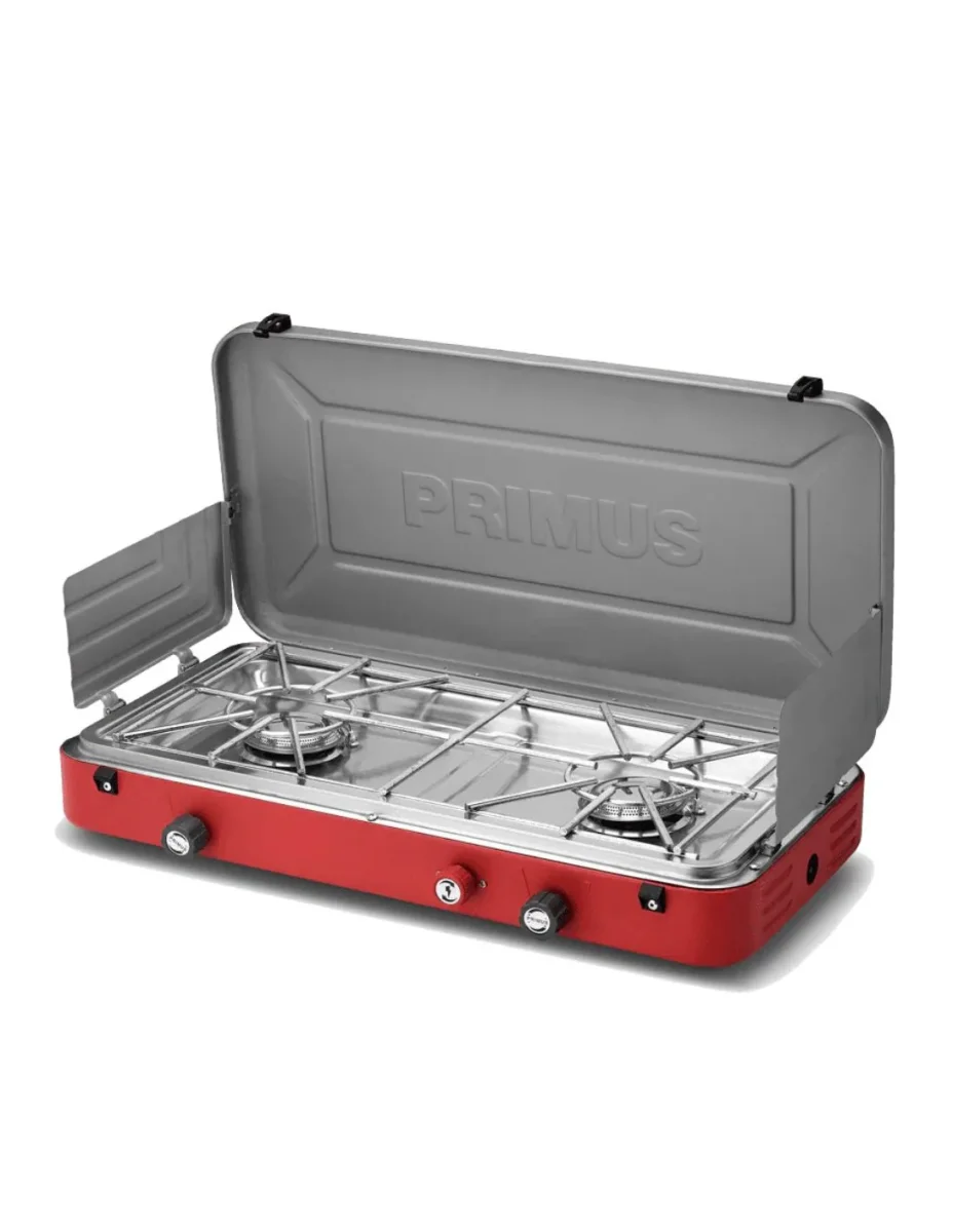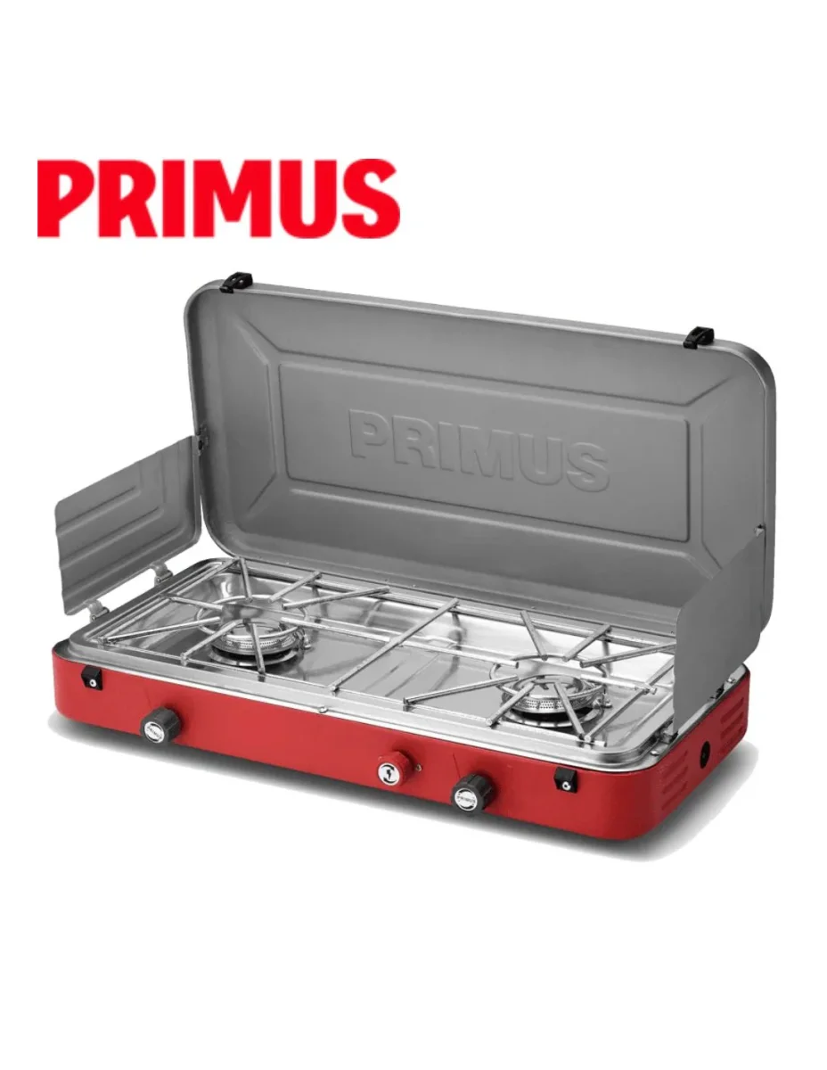 Cocina Primus Atle 2 fuegos con tapa y piezo 2x3360w para bombona CC. El Atle de Primus es clásico muy apreciado y popular. El hornillo Atle de Primus plega y se guarda fácilmente. Está equipado con una cerradura y asa de transporte, lo que hace que sea fácil de llevar transportar. Hay espacio para grandes ollas y sartenes. Las dos llamas son ajustables por separado.