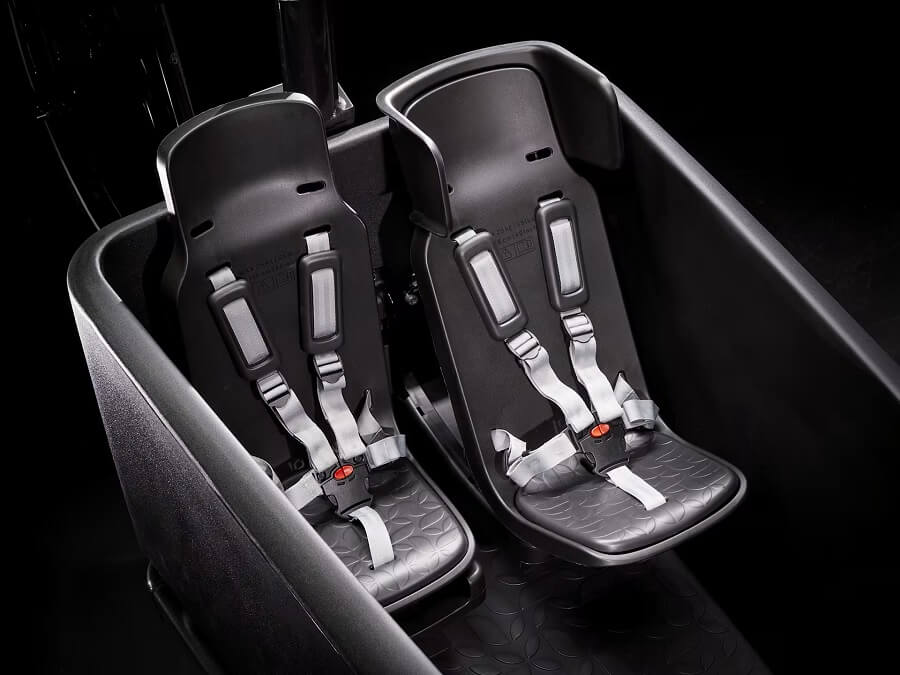 Un robusto cuadro de aluminio con caja delantera configurable con un banco y dos sillines infantiles.