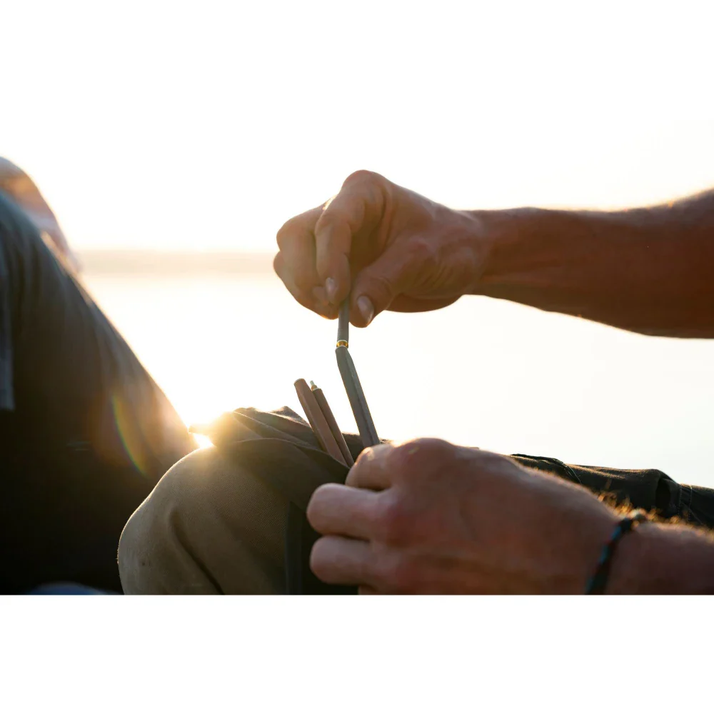 Algunos alimentos solo se pueden comer con palillos. Punto. Los palillos CampFire están hechos de palisandro y latón. Constan de dos partes desmontables para facilitar el embalaje y almacenamiento. Simplemente júntelos cuando sea la hora de la cena. El acoplamiento de latón roscado los hace resistentes para usar. Incluye funda de tela.