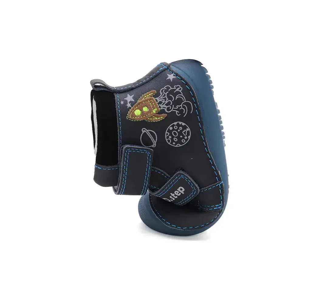 Color: Azul oscuro con un cohete cosido. Suela azul que brilla en la oscuridad.