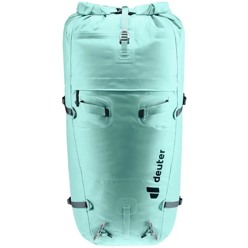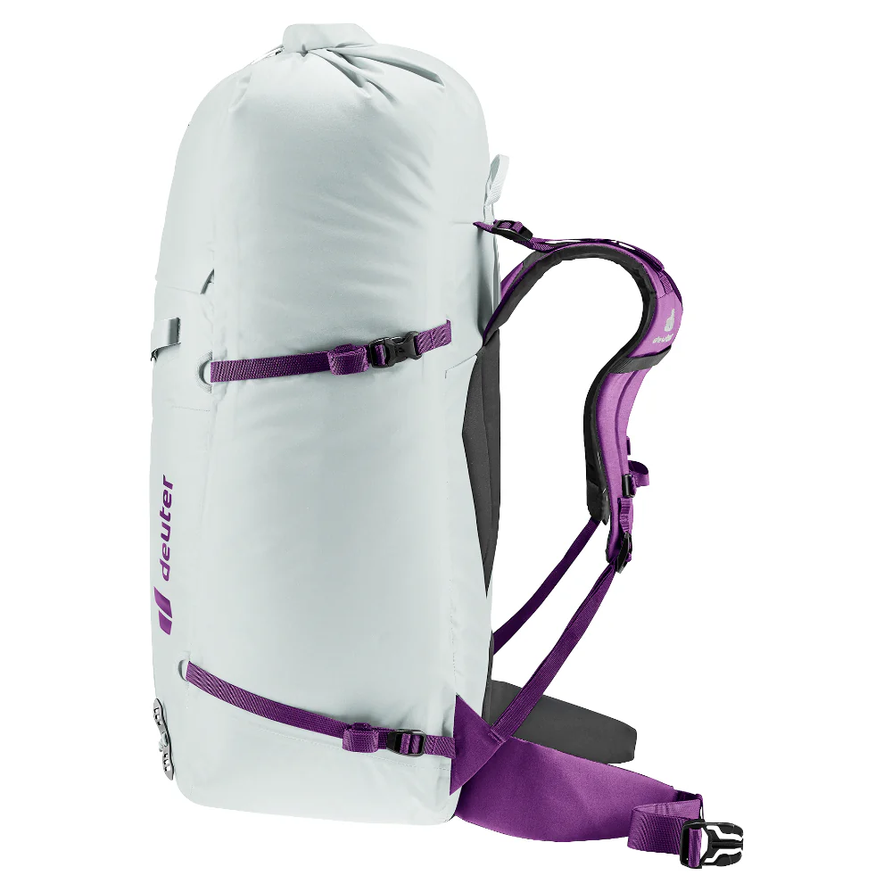 Para los adeptos a la optimización del peso, una placa de protección extraíble permite reducir el conjunto. Un bolsillo delantero con cremallera, solapa impermeable y llavero ofrece un almacenamiento seguro. La mochila está equipada con fijaciones para piolets y una correa de fijación para cuerdas, así como presillas para fijar un casco (malla para casco opcional) y hebillas porta-material. Las sujeciones para correas de compresión laterales y una sujeción para gafas completan sus funcionalidades. Las correas de compresión laterales también están diseñadas para sujetar esquís y otros materiales.