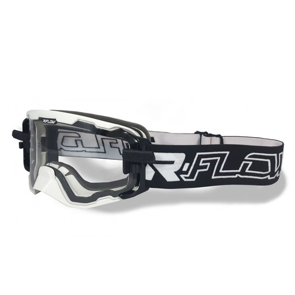 Las gafas antivaho R-Flow Next de color blanco y negro son la última evolución del modelo R-Flow MT4: permiten un mayor campo de visión, es apta para usuarios de gafas y con una lente grande con gatillos TRIG.