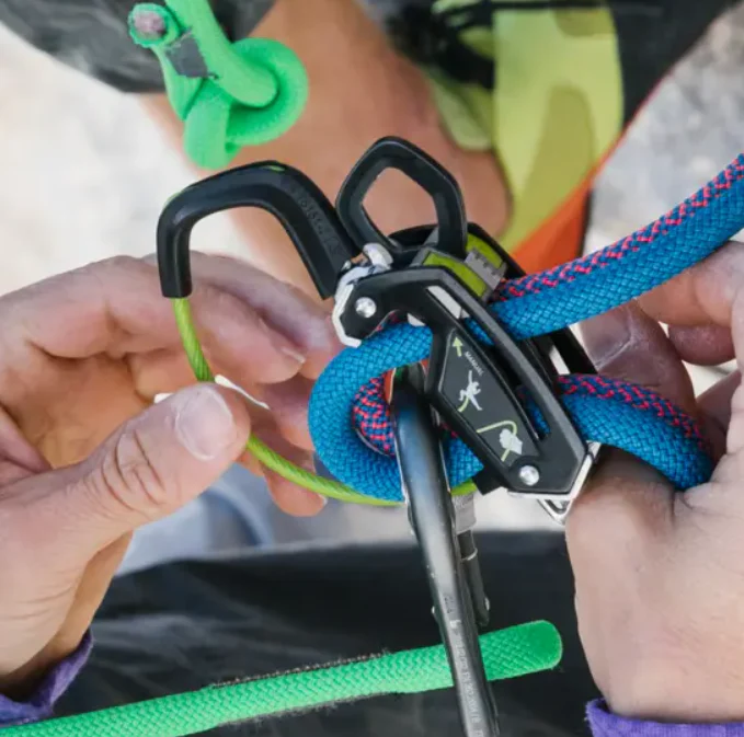 - Modo guía: permite un rápel simple y rápido, asegurar a los segundos de cordada y ofrecer un aseguramiento cómodo desde la reunión con cuerda doblada.