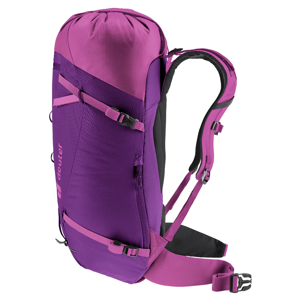 La mochila Deuter Guide 28 SL Jade Frost es duradera y resistente al agua y a la abrasión. Las correas de compresión ayudan a estabilizar la carga y mantener el equilibrio, mientras que el sistema de fijación para piolet y casco ofrece seguridad adicional para tu equipo.
