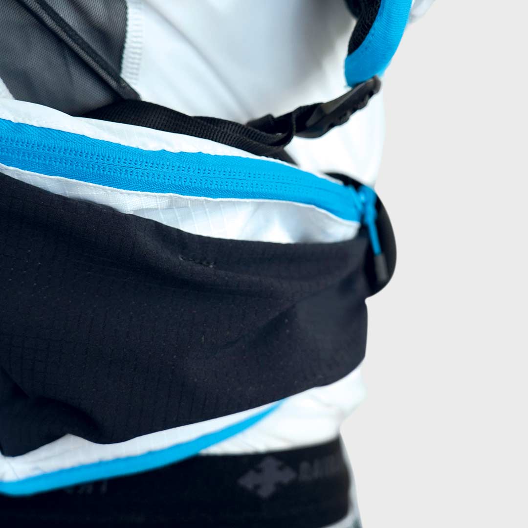 – 2 bolsillos grandes con cremallera para botella, petaca de 600 ml o teléfono en las correas de los hombros
