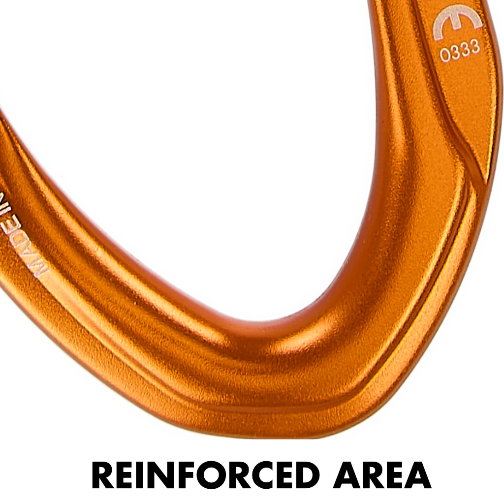 - zona de contacto con el anclaje reforzado para garantizar una mayor duración del mosquetón en el caso se utilice de forma intensa;