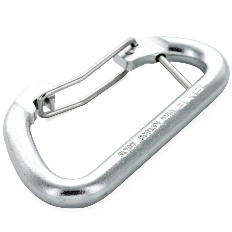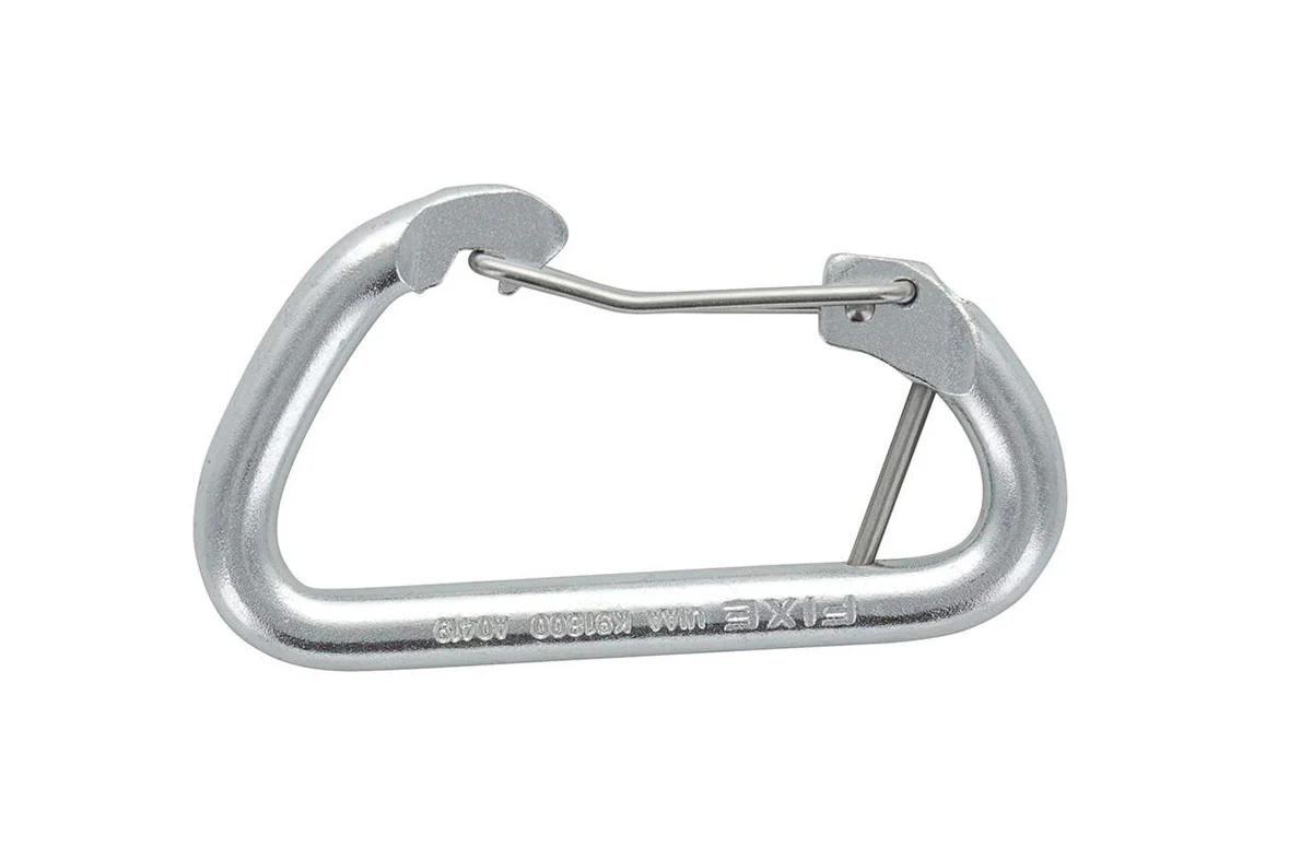 El mosquetón Indus de acero reduce el desgaste por uso repetitivo y el cierre de fijación evita giros o desmontajes de terceros. El montaje de las dos piezas a cargo del comprado