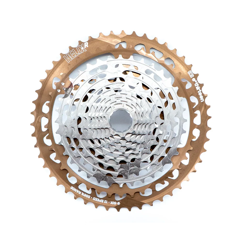 La pacha HELIX R es una actualización de cualquier transmisión SRAM™ Eagle ™ o Shimano™*, con más rango que cualquier otro casete del mercado. El piñón de 9 dientes le permite reducir un tamaño de plato mientras mantiene el mismo engranaje de extremo superior y proporciona no solo una mejor distancia al suelo, sino también una transmisión más liviana en general.