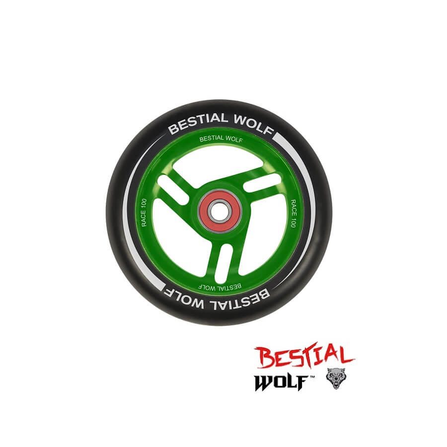 Ruedas originales de Bestial Wolf, fuertes y ligeras, construidas con núcleo de aluminio y PU85 Compound MDI. Especialmente diseñadas para rodar en Scooters Pro.