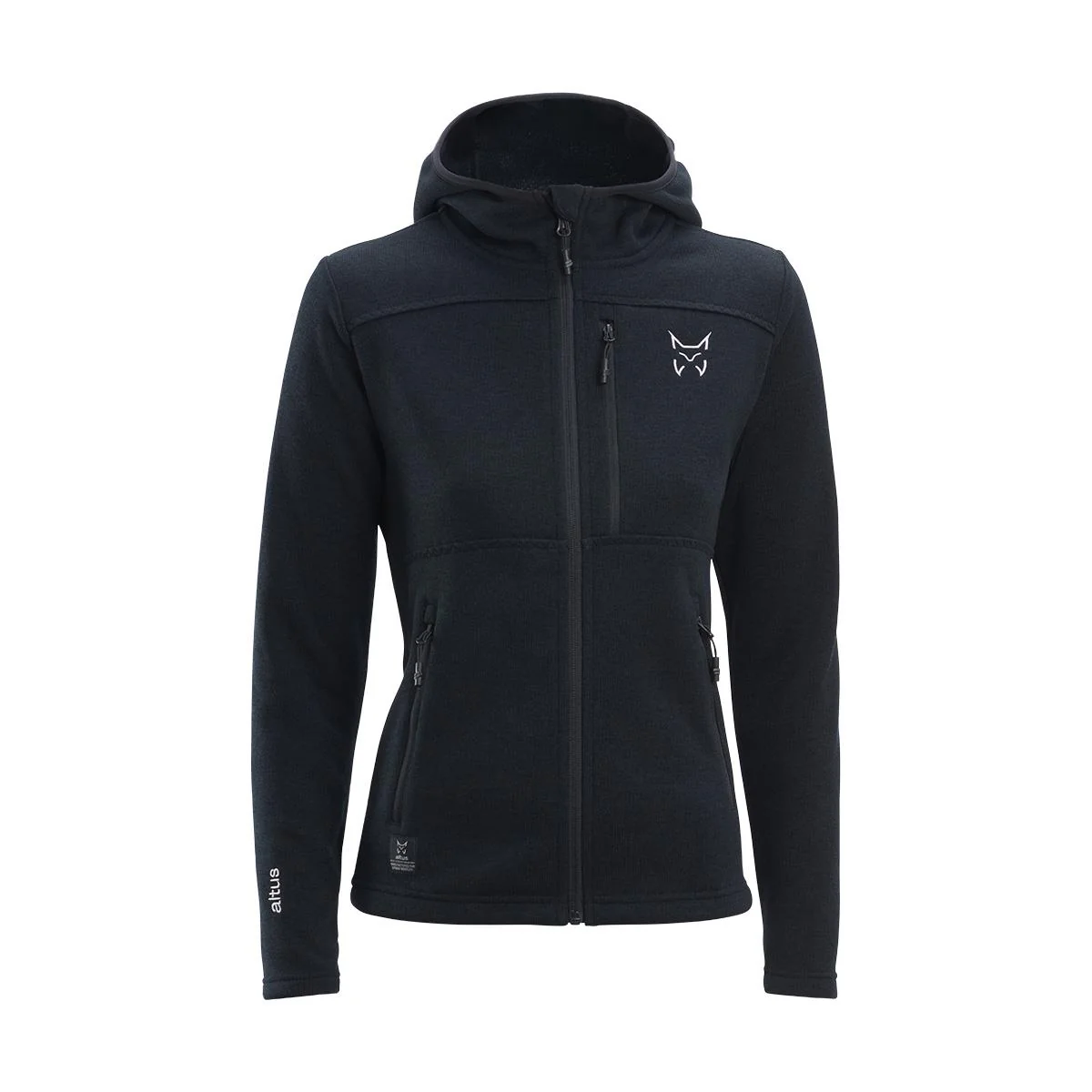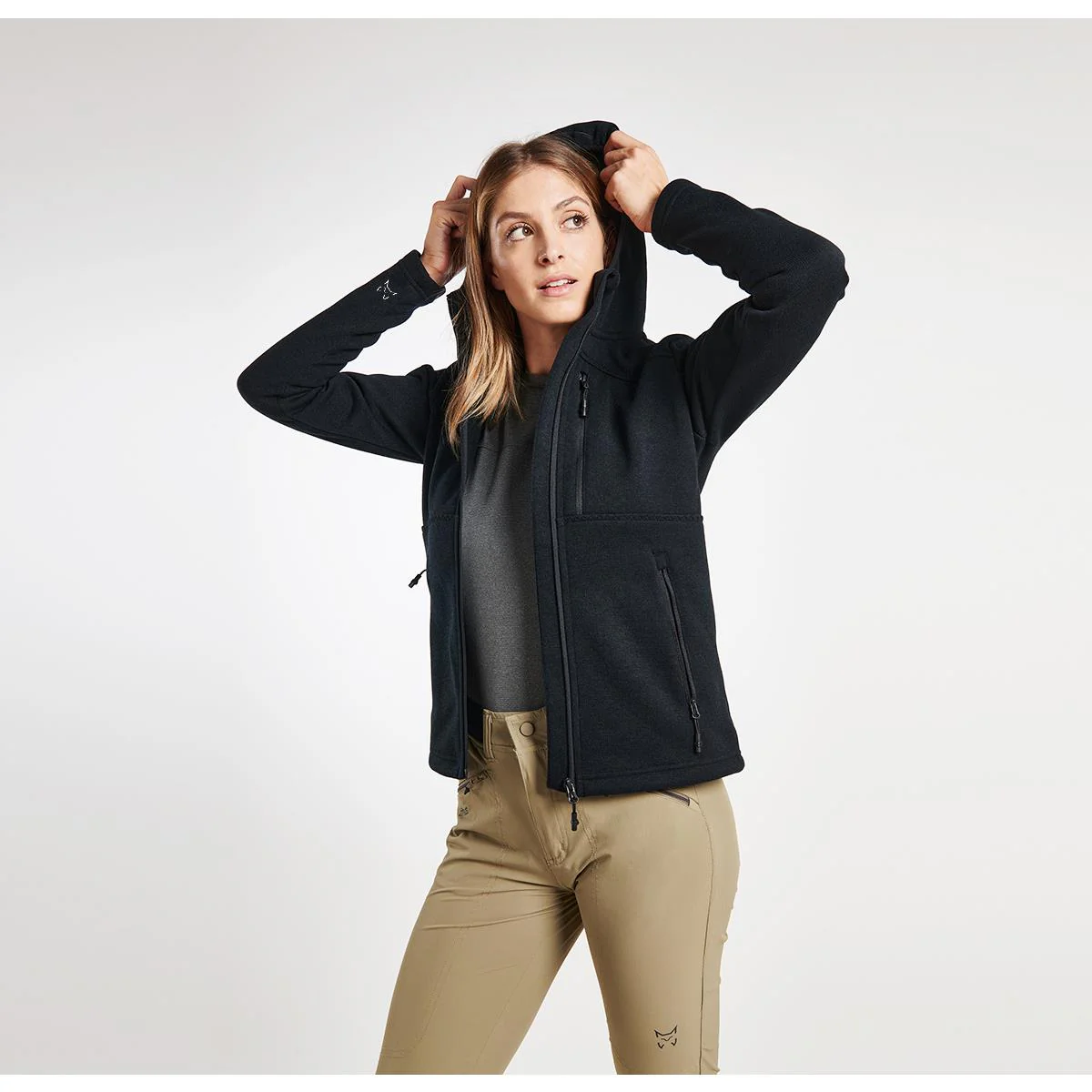 · Capucha fija con ajus te frontal.