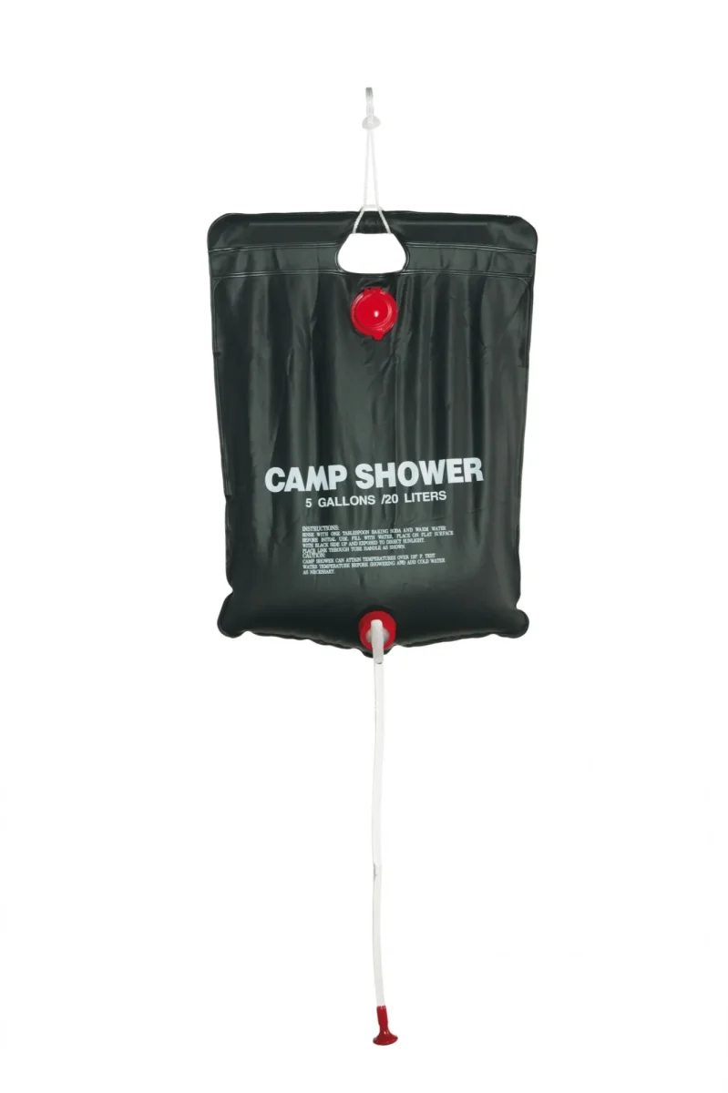 Ducha solar de PVC con válvula para bloquear el flujo del agua y cuerda para enganchar. El agua se calienta después de una exposición al sol de unas 2/3 horas.