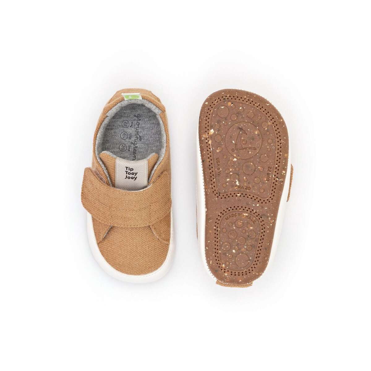 El exterior de estas zapatillas veganas de Tip Toey Joey es de lona ecológica reciclada. El interior de las zapatillas es una malla de algodón. La suela exterior está hecha de caucho natural suave y flexible y es totalmente antideslizante.
