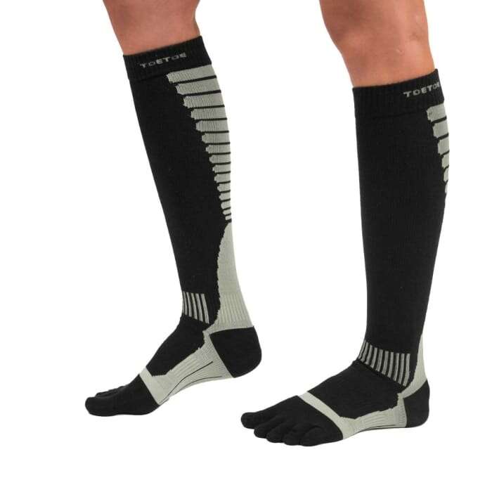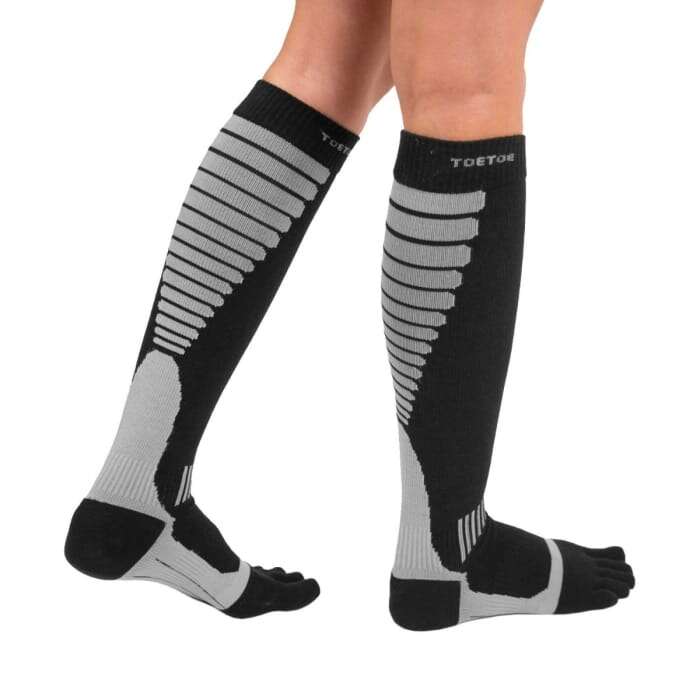 El grosor liviano ofrece una capa de tejido de punto zonal alrededor del pie para un ajuste perfecto de 360°. Una banda elástica asegura la media alrededor del arco del pie. Las medias de compresión de dedos de Toe Toe están diseñados para hacer deporte, correr, trotar, caminar ligeramente, vuelos de larga distancia y cualquier actividad de movimiento relacionada.