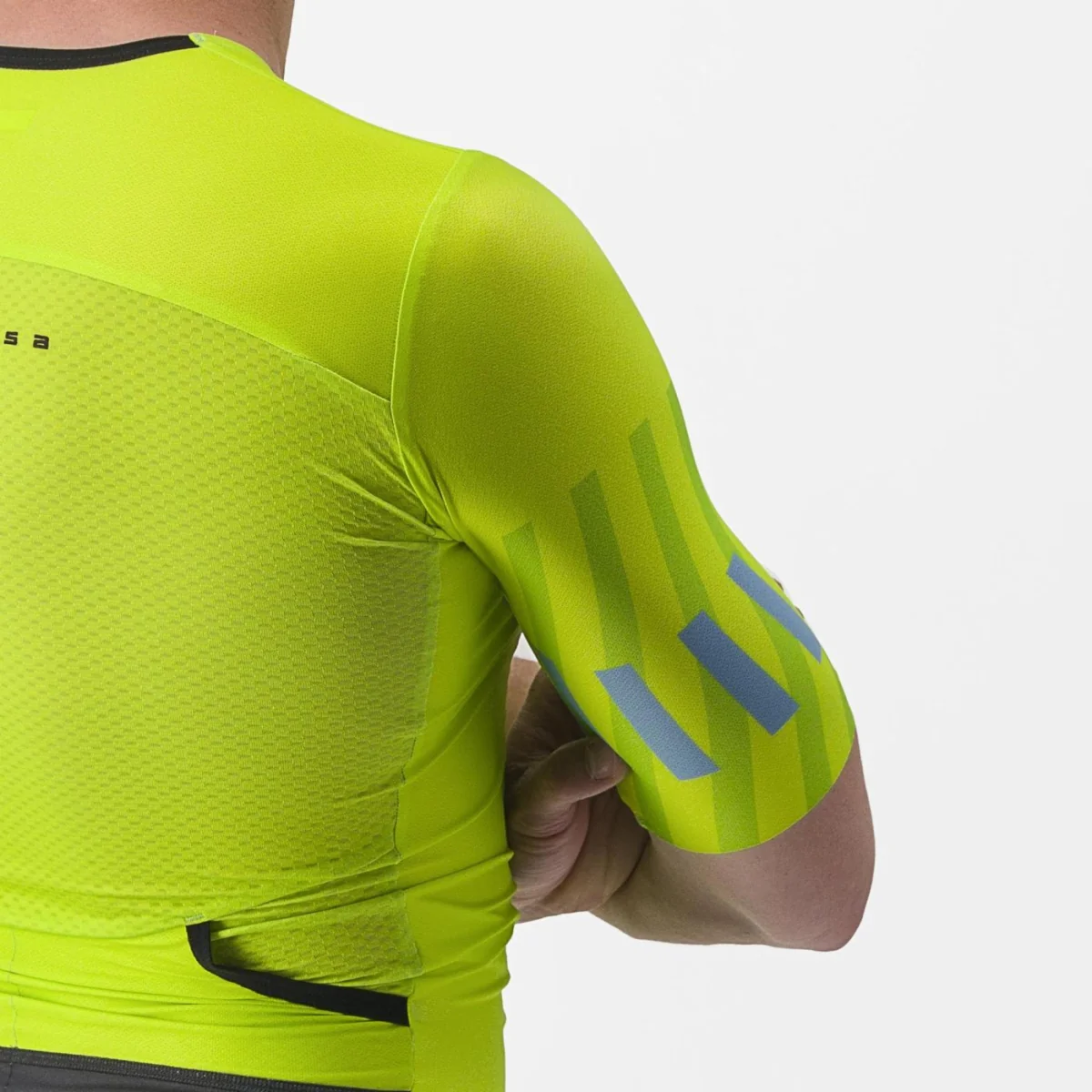 - La abertura frontal Sanremo de Castelli hace que sea más fácil doblarse para andar en bicicleta y enderezarse para correr y nadar, al mismo tiempo que permite descansos más fáciles en la naturaleza o se abre para carreras extra calurosas.