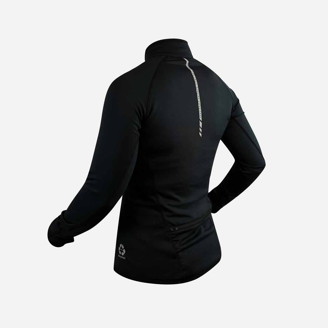 El cuello alto con una amplia cremallera garantizan una buena protección del cuello pero la cremallera está protegida para evitar doloroso enganchones. Cuenta con mitones y orificios para los pulgares en los puños para aislar a la perfección las manos del frío. Muy funcional, incorpora dos bolsillos laterales con solapa. Refuerzos de silicona en los hombros.