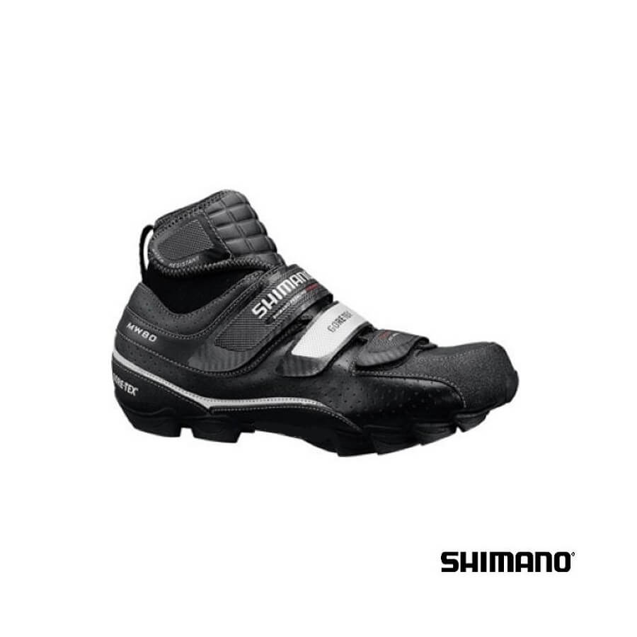 Las zapatillas Shimano SH-MW80 ofrecen una buena protección ante el frío y el agua gracias a su membrana Gore-Tex y un calcetín de neopreno interno. Estas zapatillas están disponibles en color negro con detalles reflectantes.